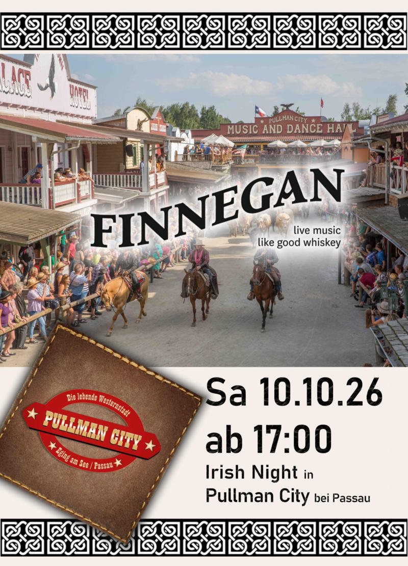 Western-feeling pur! Finnegan spielt in der Pullman City bei Passau ihre besten Irischen und Country-Songs. We love it!Freitag, 20. November 2026 ab 21:00